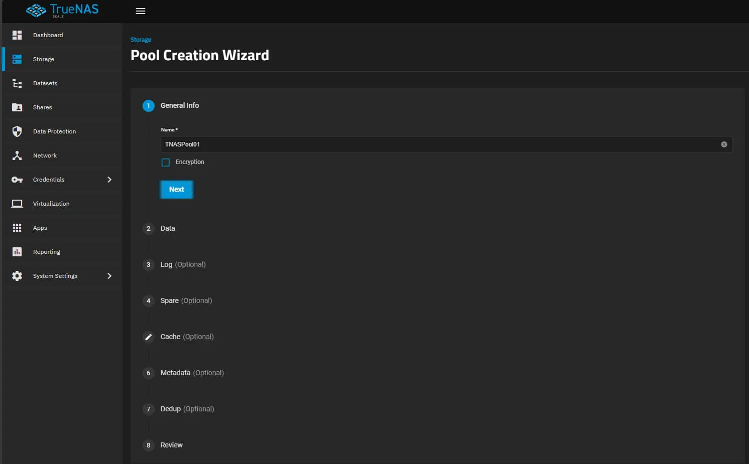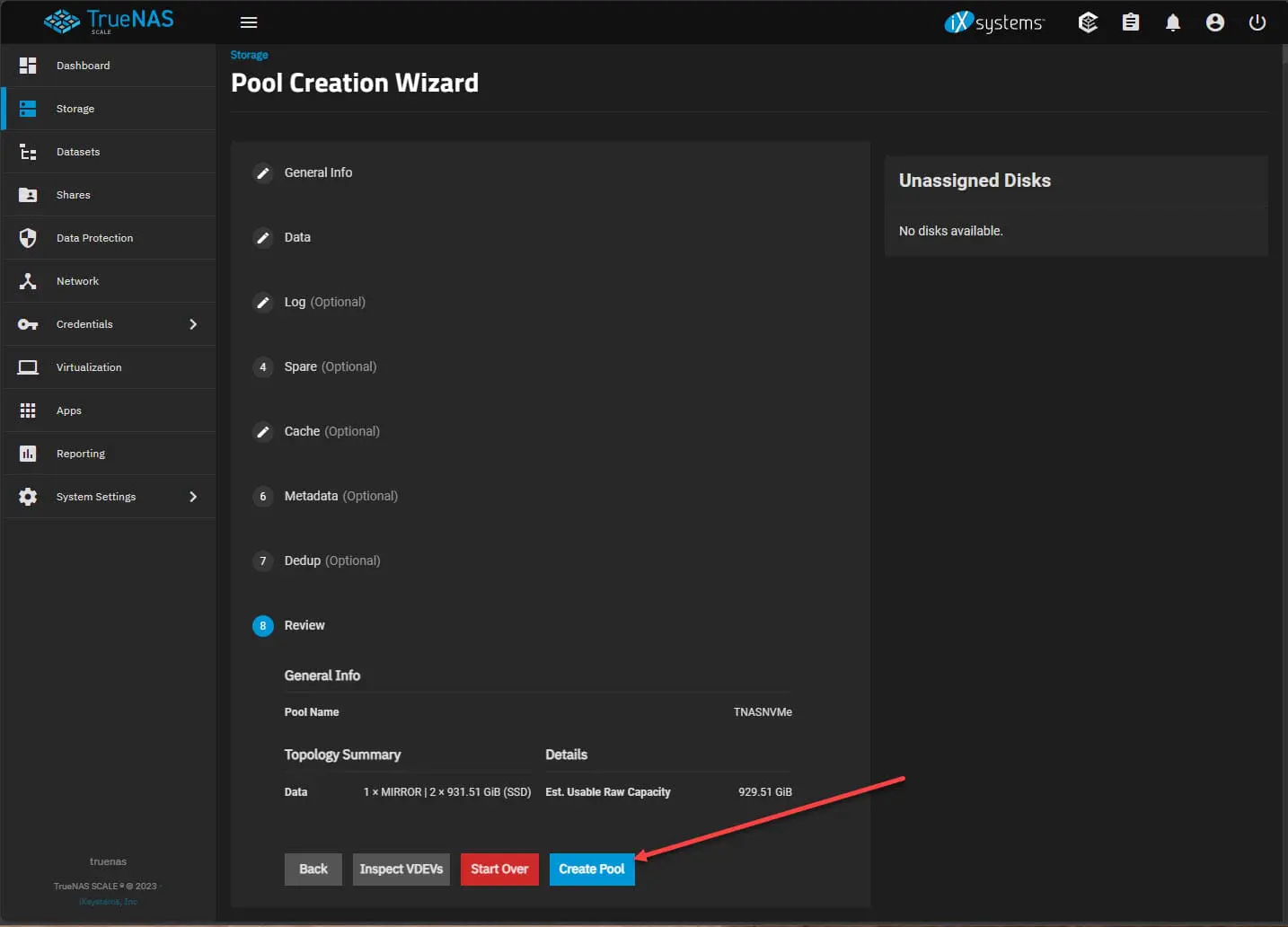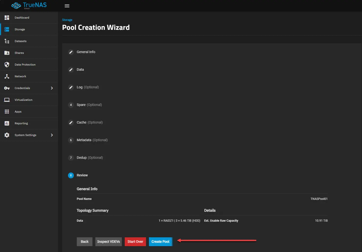 There are a few other optional settings, like Cache Disks, etc. I toyed around with using one of the NVMe drives as cache. However, since I am mainly going to use these for virtualization, I wanted to dedicate these in their own pool. The traditional spindle storage pool will be used mainly for generic file storage, etc.
