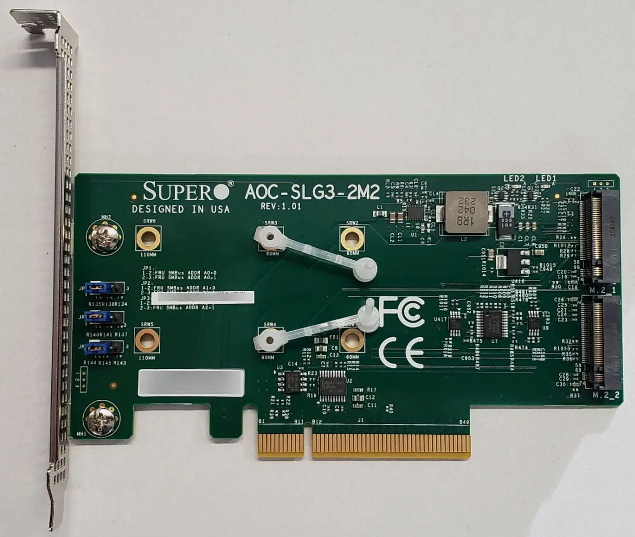 To add the (2) NVMe drives into the system, I have a Supermicro AOC-SLG3-2M2 card installed: