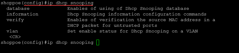 In the global configuration mode, enable DHCP snooping for the entire device by typing the command: