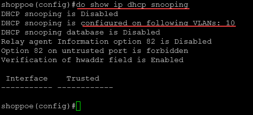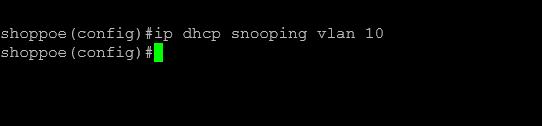 After enabling on vlan 10, you can run the following command to view the status of DHCP snooping on your switch if you are still in global configuration mode: