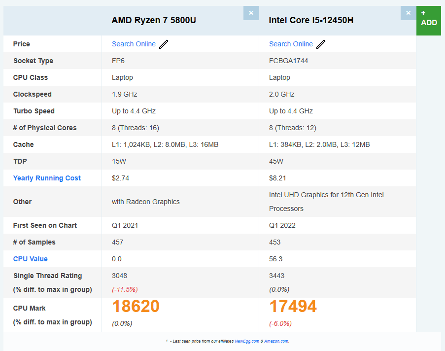 As you can see below, the 5800U is more desirable in just about every area, even though it isn’t as new as the Core i5-12450H.