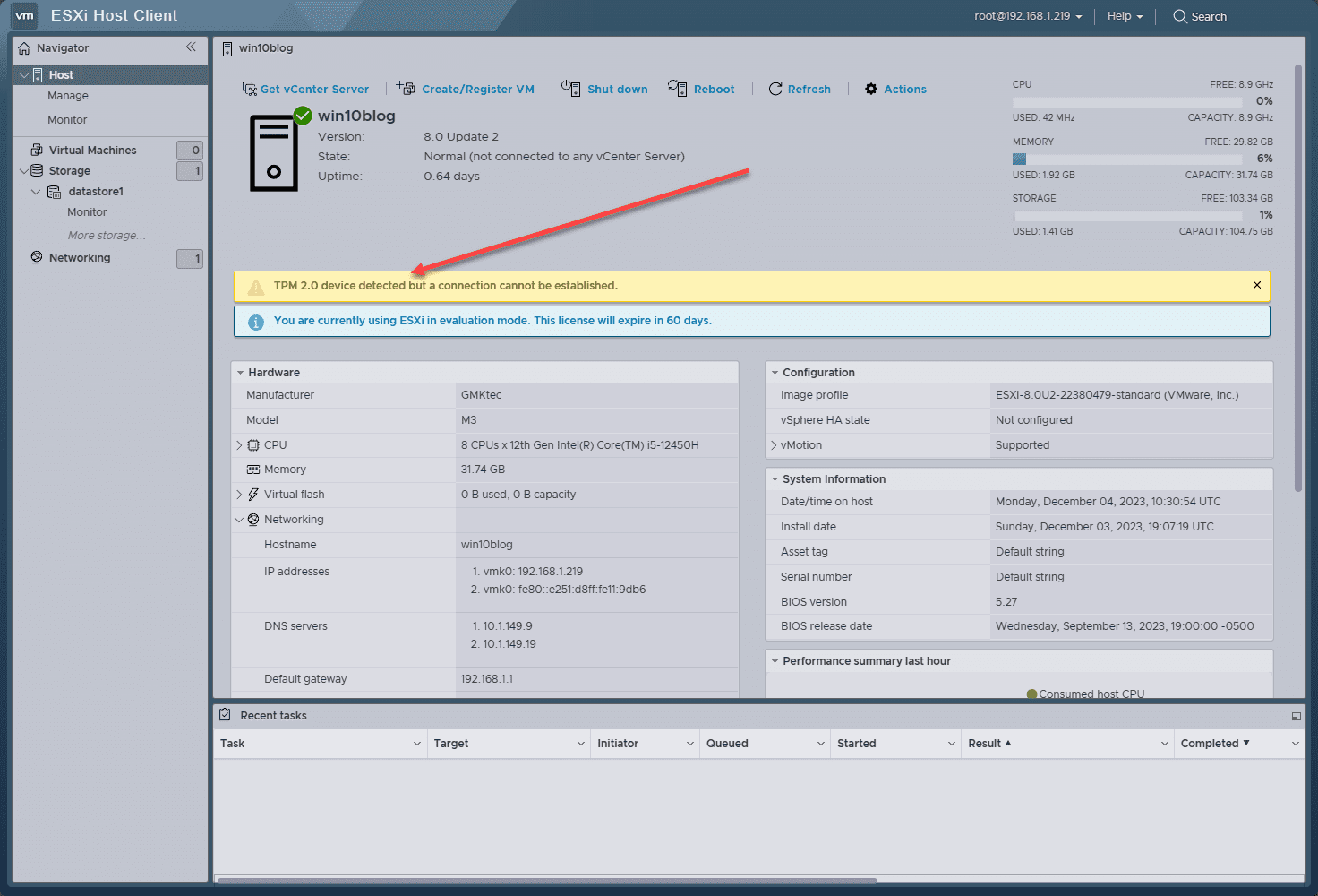 You will also see the TPM warning in VMware ESXi as you will see from most of the mini PCs that have TPMs installed. This is due to the type of TPM and the way they work compared to what ESXi expects.