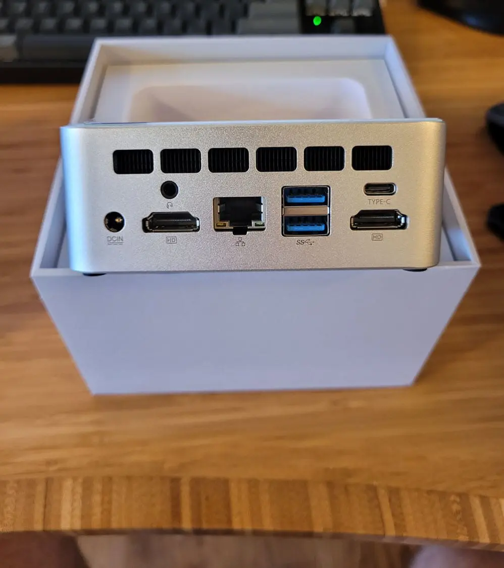 Swinging around to the back side of the M3, this is the business end of the mini PC with the power barrel connection, audio jack, HDMI ports, 2.5 Gbps LAN port, (2) more USB-A ports, and a USB-C port. As you can see, there are no Displayport 1.4 ports.