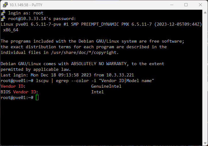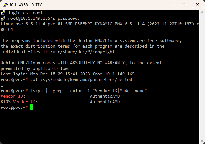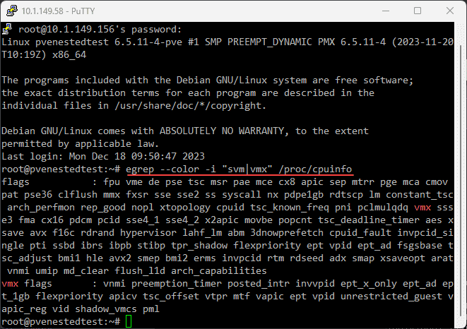 First, determine if your Proxmox host’s processor supports nested virtualization. For Intel CPU, use the command SSH into your Proxmox host as root and run the following: