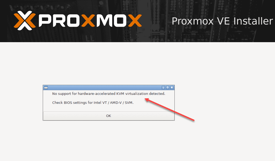 What will you see if there is no support for nested virtualization? Note the following error message displayed when trying to install a nested Proxmox hypervisor as a VM on a Proxmox physical host: