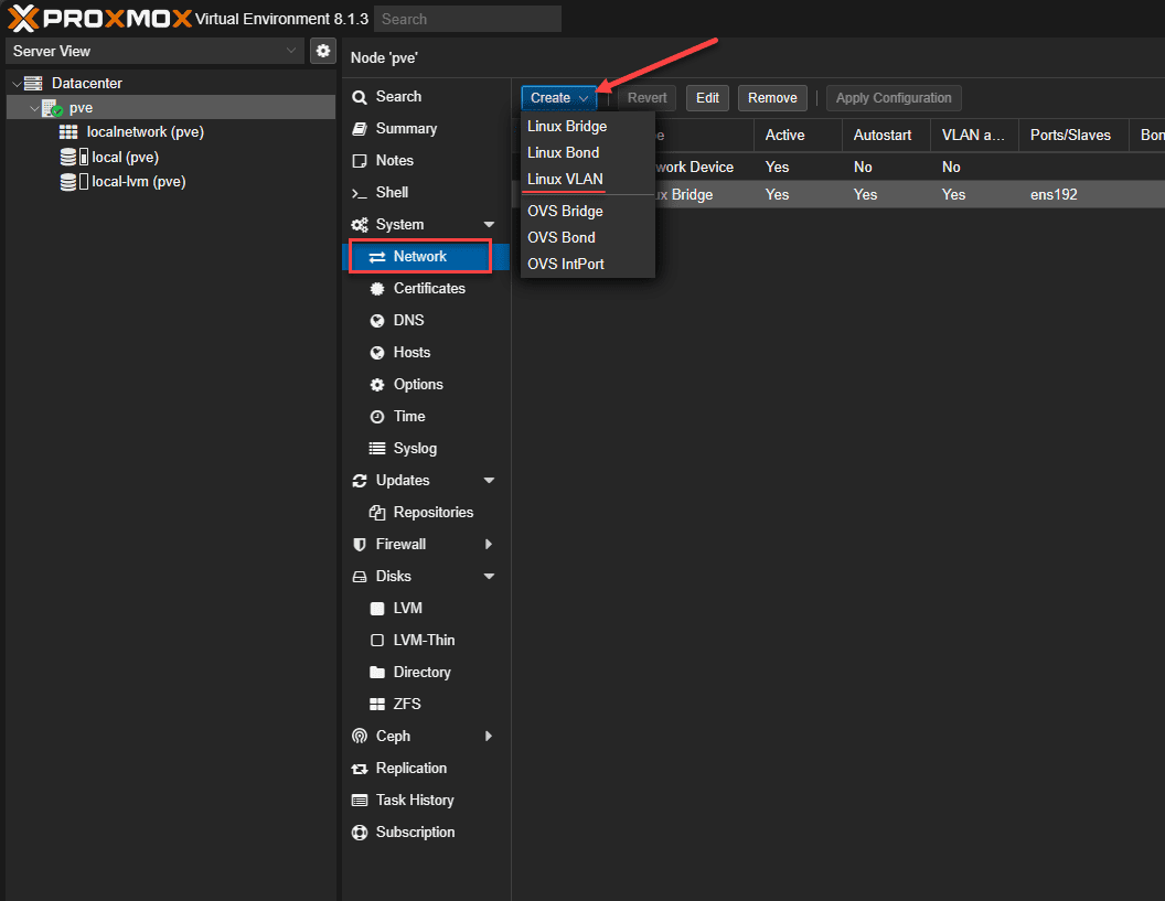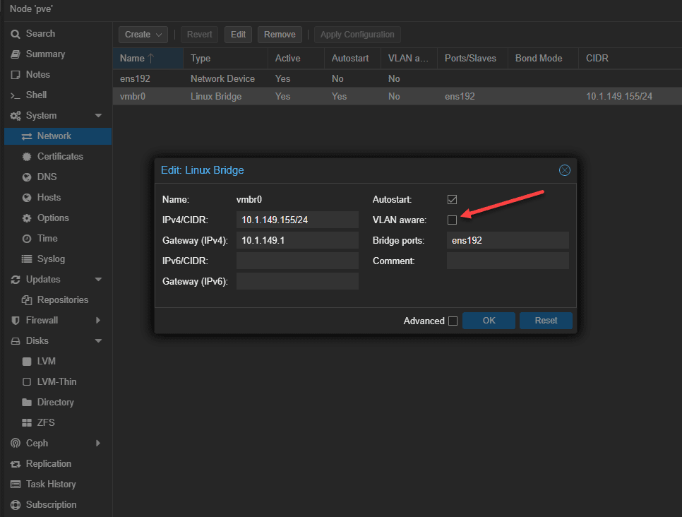 When you edit the default Linux Bridge, you will see the checkbox VLAN aware available on the Linux Bridge properties. Also, you will see basic networking configurations like the IP address and subnet, gateway for routing, etc. Place a check box in the VLAN aware checkbox.