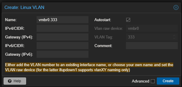 Now we can populate the new Linux VLAN with the appropriate configuration. Once you name the VLAN with the parent vmbr0 interface, you will see the VLAN raw device and VLAN Tag greyed out. This essentially says we are creating a new Linux VLAN on the parent Linux Bridge interface, vmbr0.