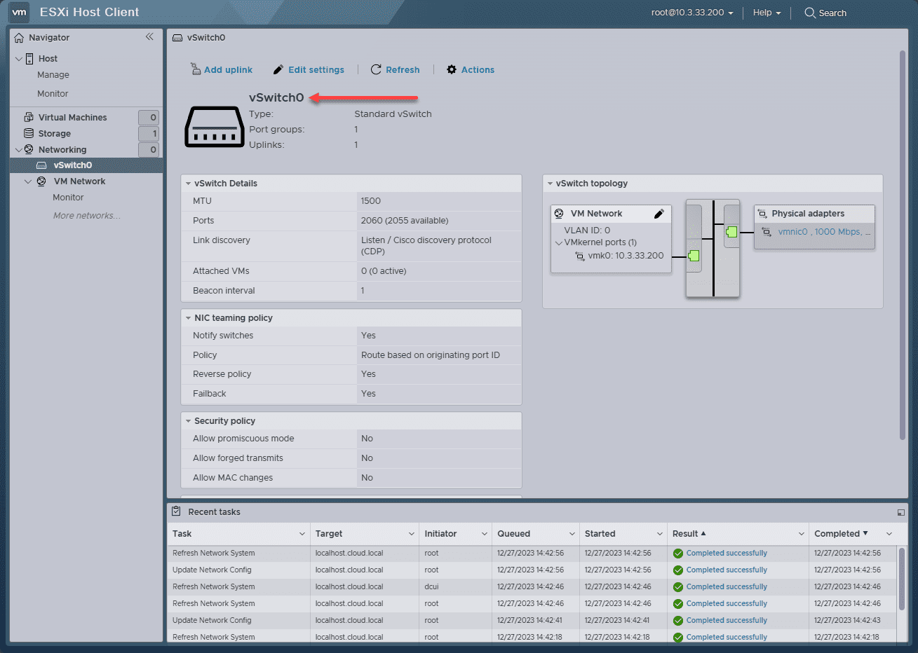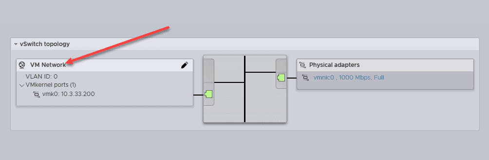 This is very similar to the default vSwitch0 created in VMware ESXi right out of an install. As you can see below, we have a physical network adapter backing vSwitch0.
