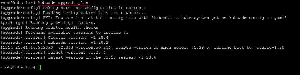 As you can see below, it checks the configuration, reads the configuration from the cluster, runs a pre-flight check, health checks and checks the current version and available versions.