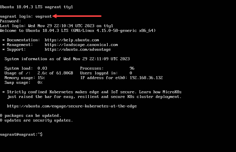 Below, we are logging into the new Vagrant VM, using the default vagrant/vagrant credentials in the VMware Workstation window.