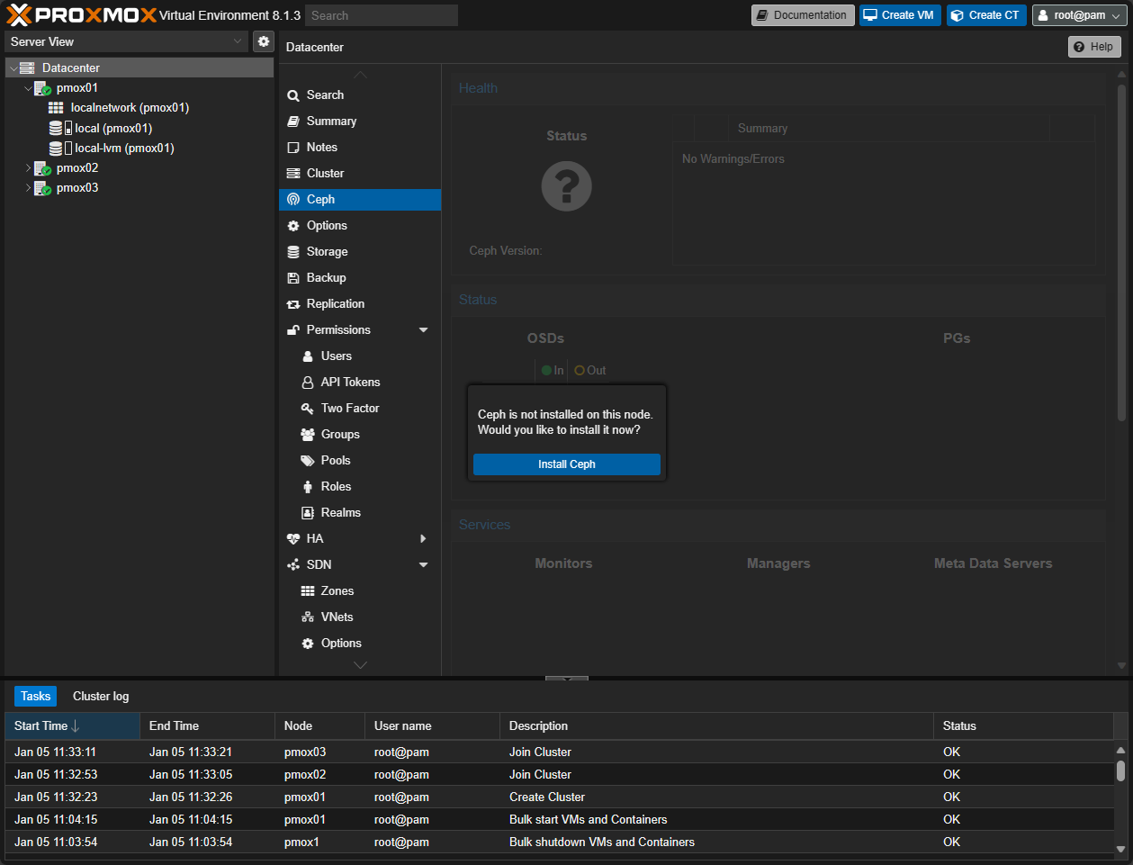 For instance, I have recently been playing around with Proxmox clustering and Ceph HCI. I was able to do this all in virtual machines without 3 or more Proxmox physical nodes.