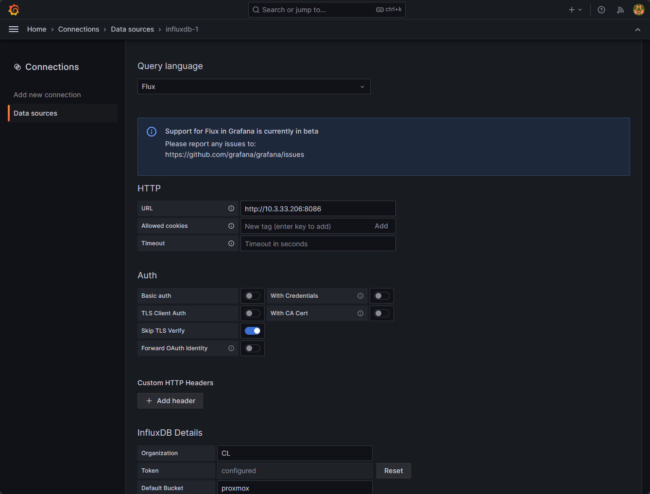 Make sure to select Flux as the query language. In this case, the URL configuration should point to your InfluxDB address. If you are using HTTPS and a self-signed certificate, you can flag on the Skip TLS verify to avoid SSL errors with your URLs.