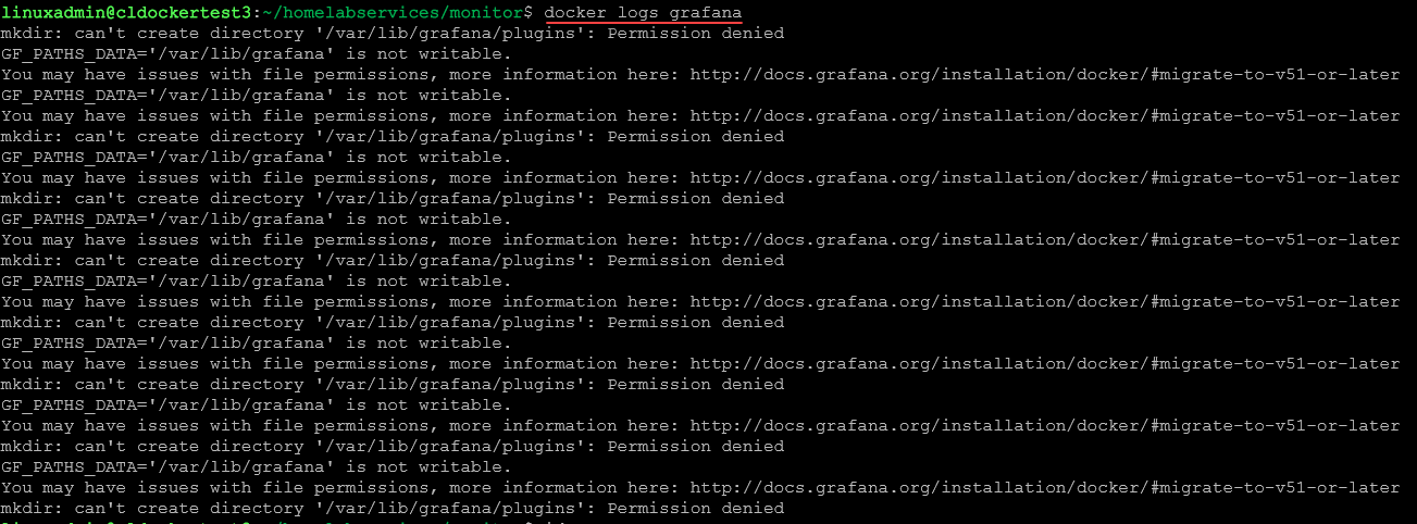 By running the command, I could see that I had a permissions problem with my Grafana container the first go-around as it needs to have access to the directory in order to place plugin files, etc.