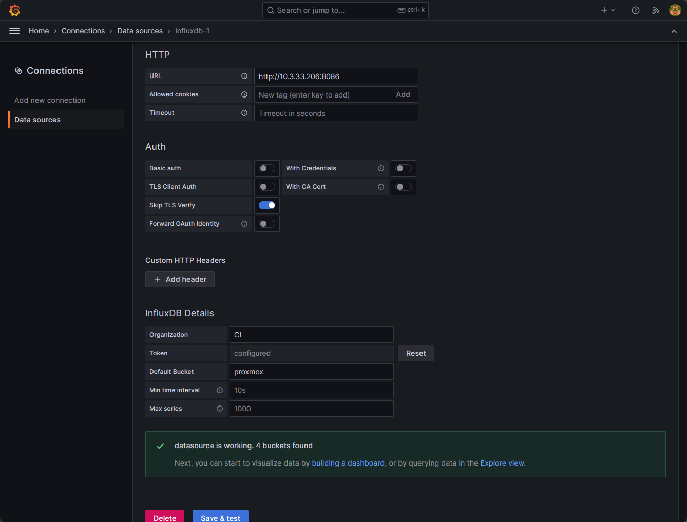 For reference, I used this really good post to create my initial configuration and modified it for my lab environment: Monitoring Proxmox with InfluxDB and Grafana (tcude.net).