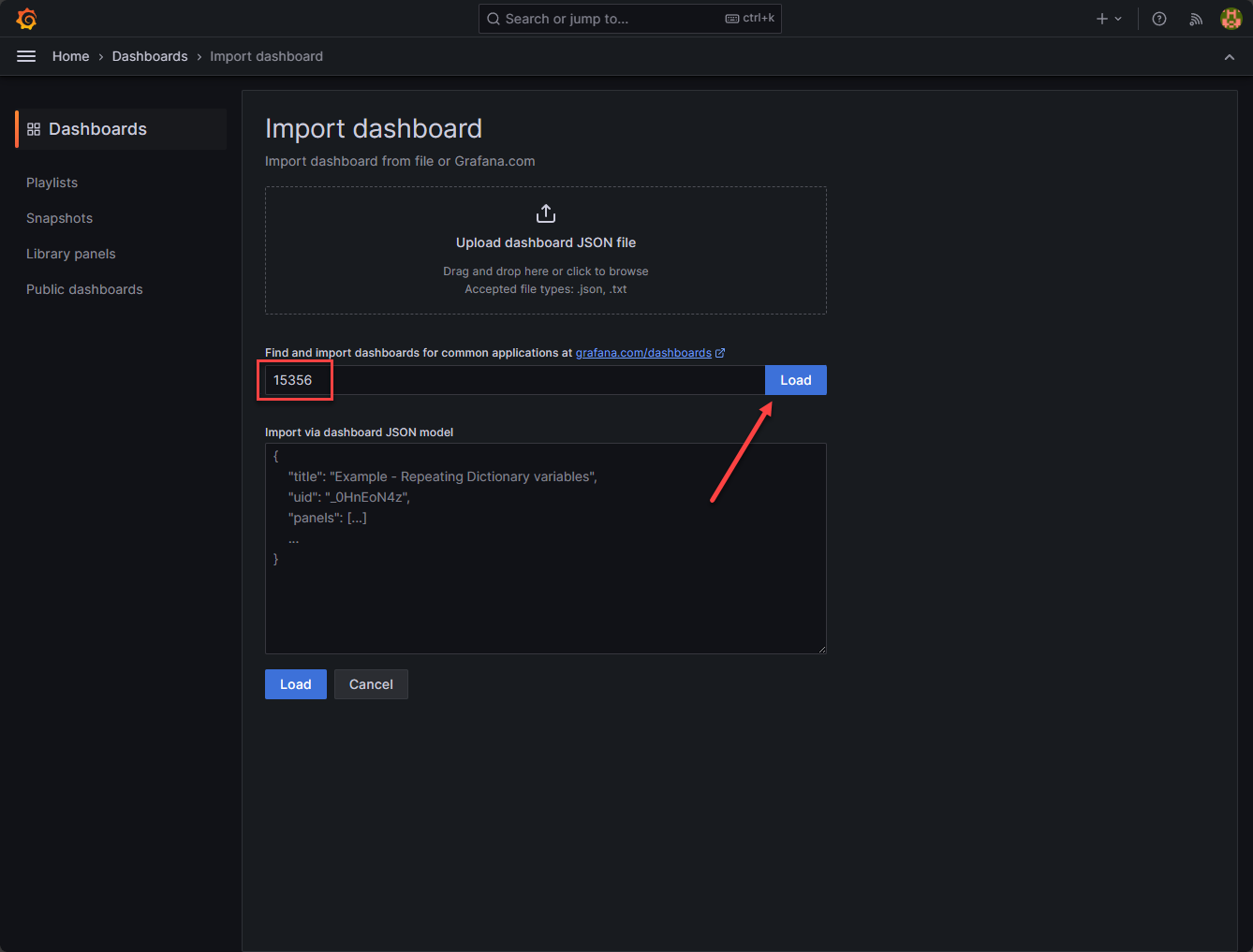 Below we are loading the community dashboard for monitoring Proxmox and clicking the Load button. You can browse all the community dashboards here: Dashboards | Grafana Labs.