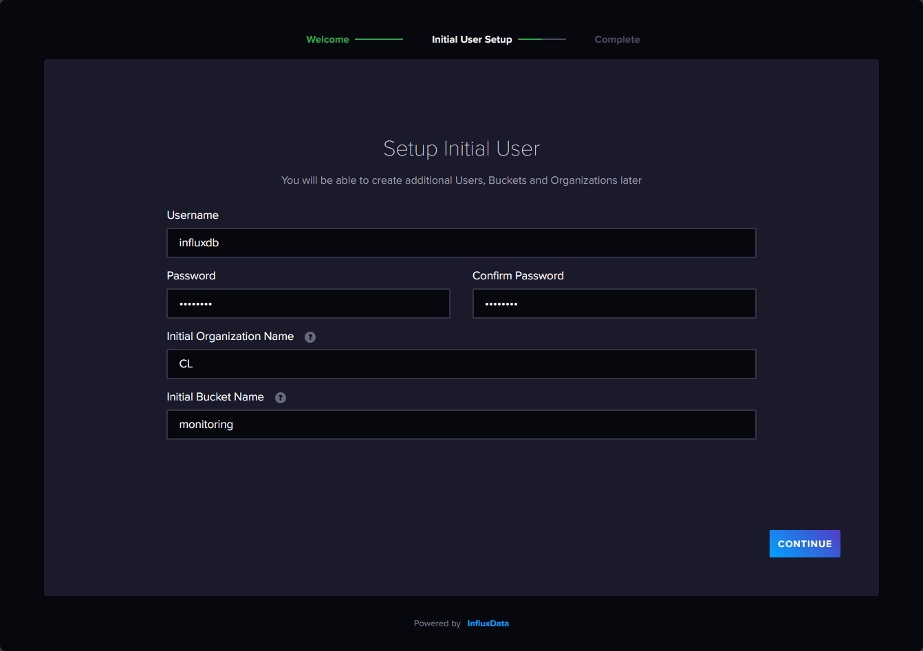 On the initial configuration page, you need to configure a username, a password, confirm the password, initial organization name, and finally an initial bucket name. Click Continue.