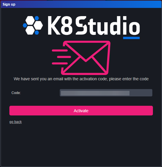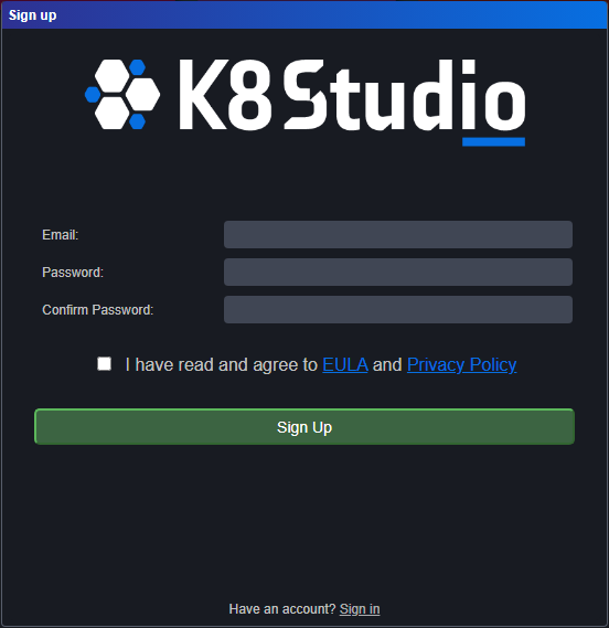 After installing K8Studio, you will be presented with the below form. You will need to sign up with your email address and choose a password and confirm it.