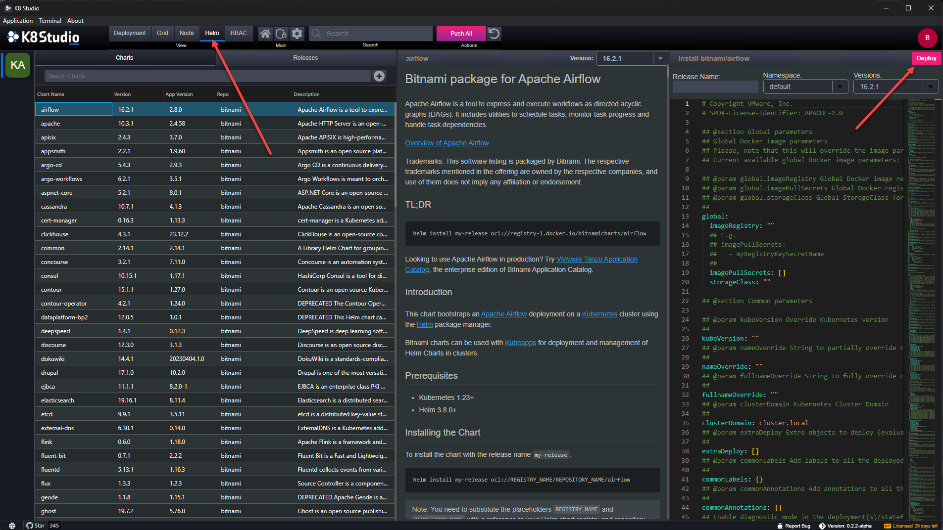 K8Studio makes it easy to deploy applications in your Kubernetes cluster with Helm. Just click on the Helm menu at the top and you will see the list of available helm charts for installation in your Kubernetes cluster. Click the Deploy button to begin the deployment.