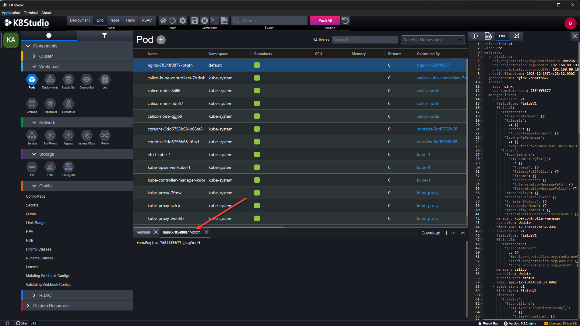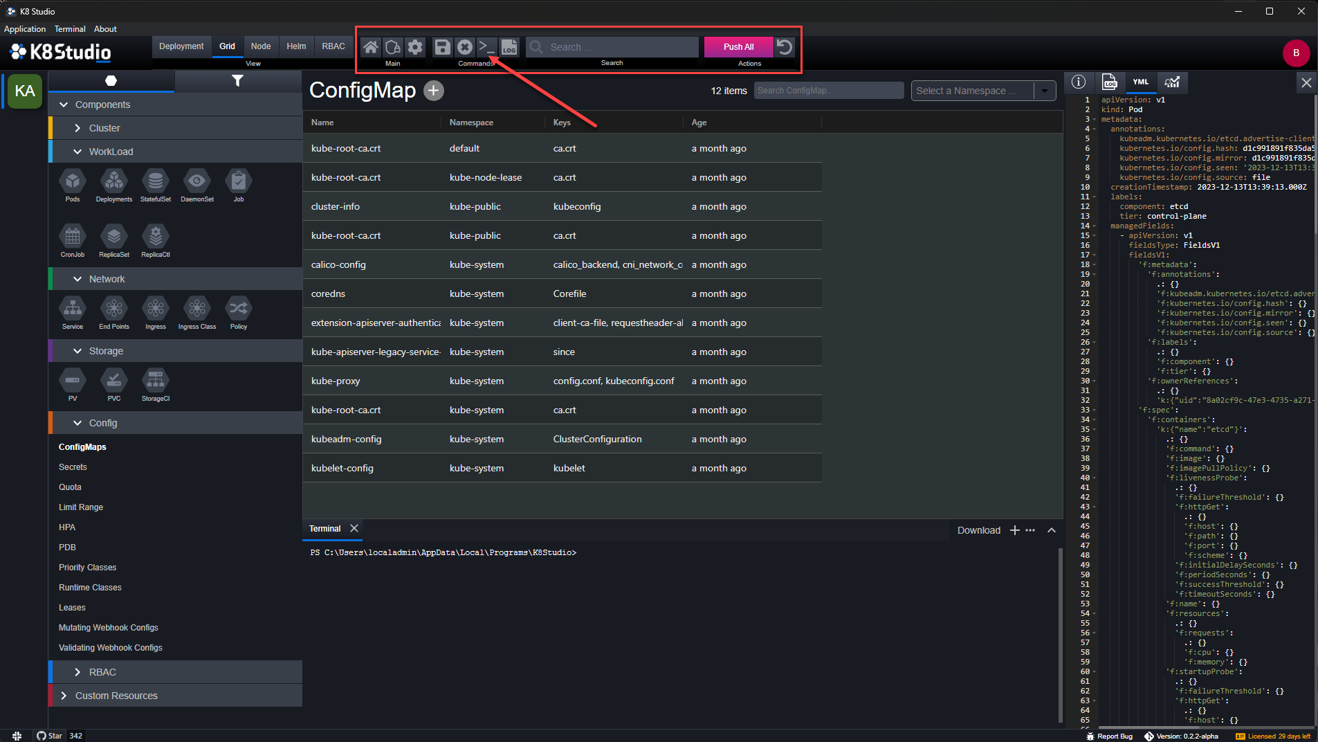 K8Studio has the ability to perform quick edits to configurations and resources within the Kubernetes cluster, making these easy to administer and modify if needed. You have quick access to the bash terminal, ability to delete resources, view logs, save changes, permissions changes, push all changes, etc.