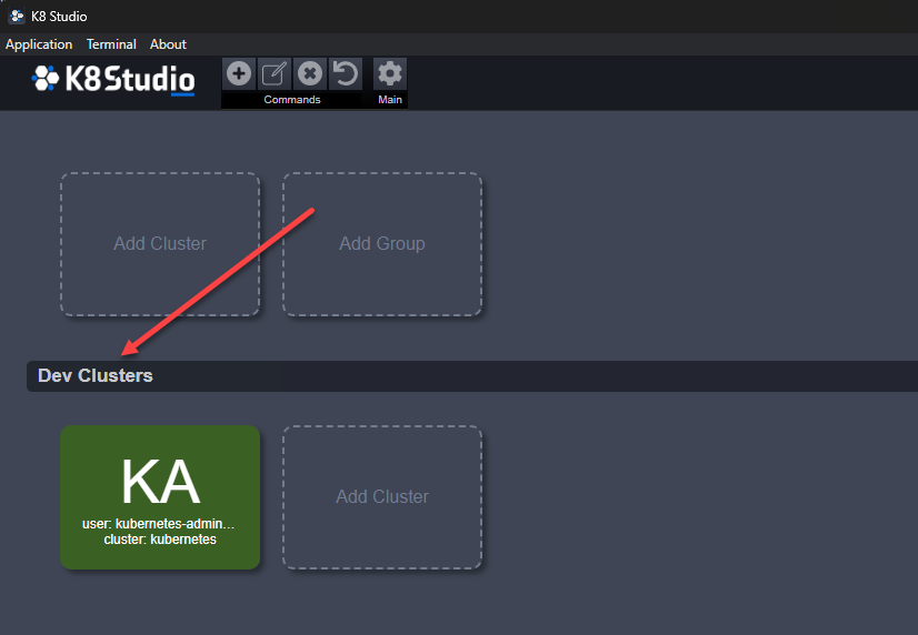When K8Studio launches, it will read from your kubeconfig file and the cluster contexts that exist in the kubeconfig file. These are represented by tiles.