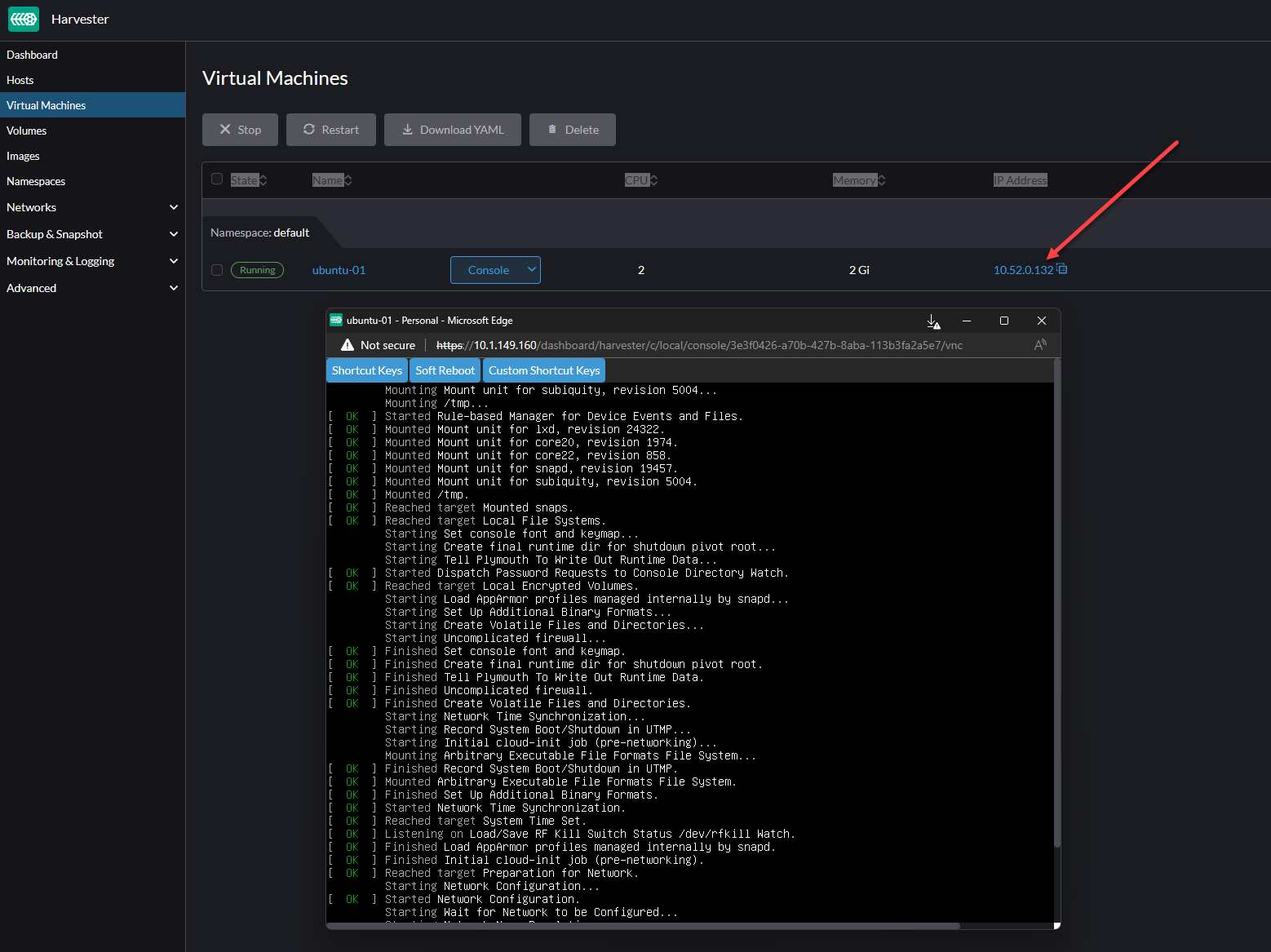 Below, I have created a new Ubuntu 22.04 virtual machine and booting the VM for installation using Kubevirt in Harvester. Very cool! The management experience in Harvester is great.