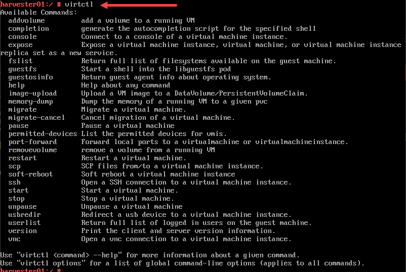 You can also interact with your Kubevirt virtual machines using the virtctl command line tool. You may need to install virtctl. However, in working with Harvester, it is installed by default.