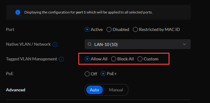 The VLAN Manager allows for precise control over how traffic is handled on each port. Options like the default Allow All, Block All, and Custom provide granular control over VLAN tagging, enabling administrators to dictate which VLANs are allowed or blocked on each port. This feature is crucial in managing traffic flow and ensuring network security.