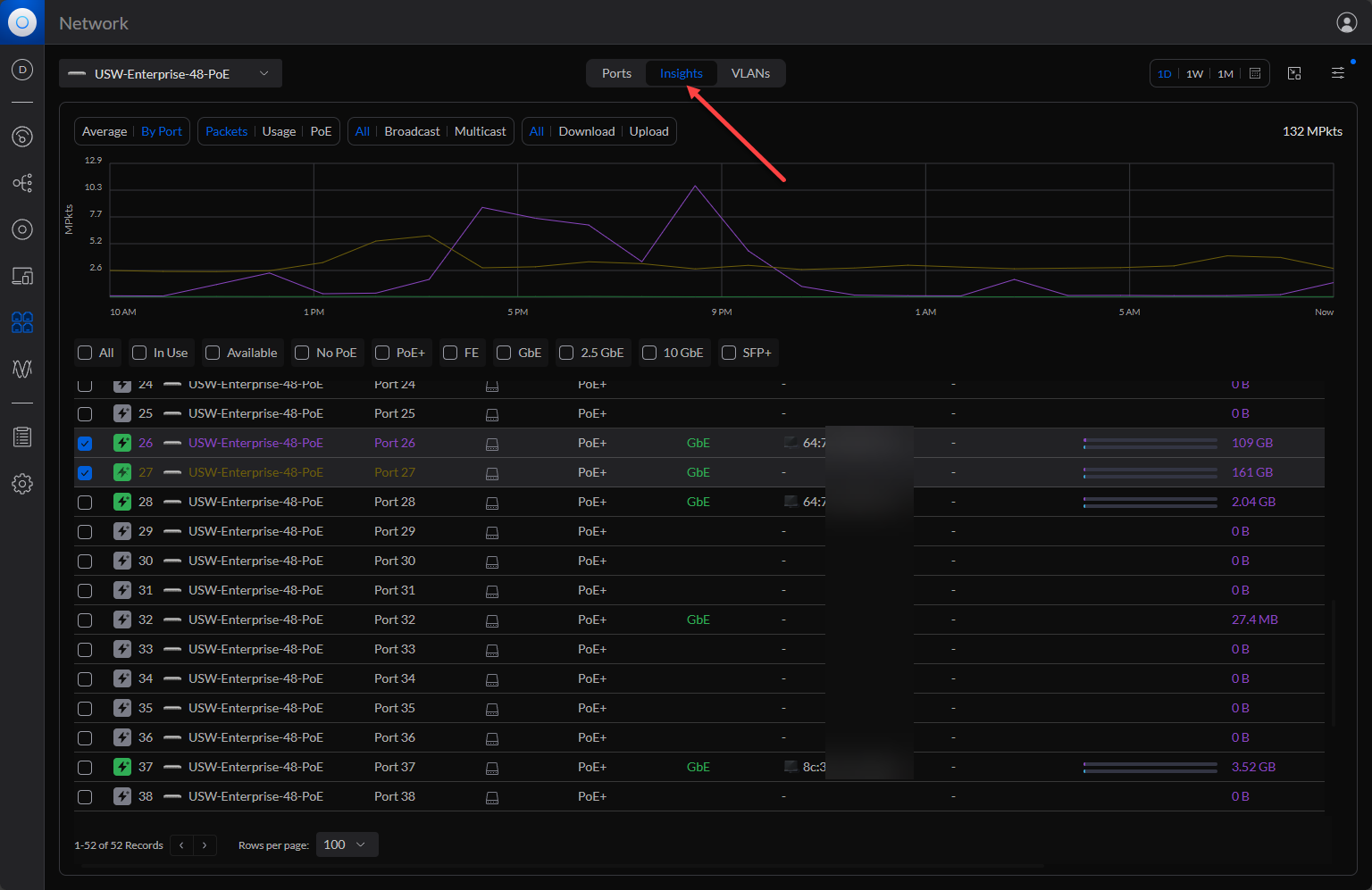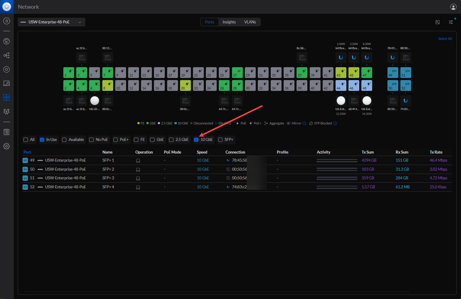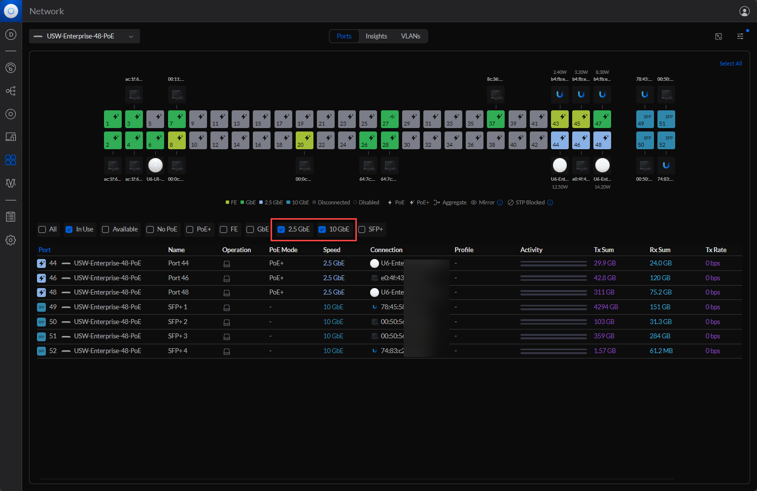 Below, I have filtered on 2.5 and 10 GbE ports. I really like the port manager gives you extremely useful information such as MAC addresses, speed, PoE mode, etc. This is great for monitoring, inventory, and creating network maps for documentation.