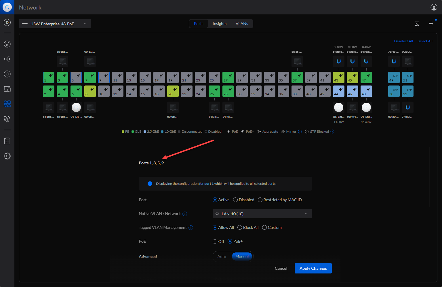The redesign of the Port Manager simplifies the user experience. The interface is more intuitive and makes it easier to manage and configure a port, like a trunk port, port profile, or multiple ports across different switches on your primary network. You can see below I have multiple ports selected.