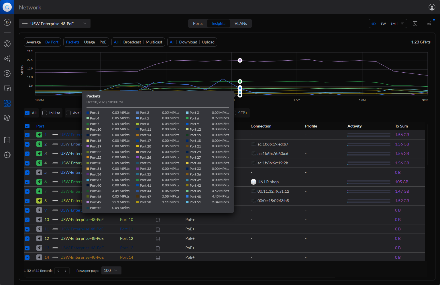 The enhanced Port Manager provides a granular view of each switch port’s status, including PoE usage and data throughput. As you can imagine, this is a great tool for troubleshooting connectivity for clients, access points, servers, and narrowing in on wireless issues or performance at the port level and optimizing network performance overall.