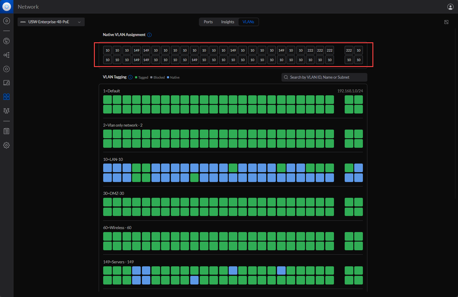 The old VLAN manager was quite clunky. However, the VLAN Manager introduces a color-coded interface, a game-changer for visualizing the native VLAN and tagged VLANs. This tool simplifies the complex task of managing VLANs, setting up your management network, and offering a clear view of VLAN assignments across the network.