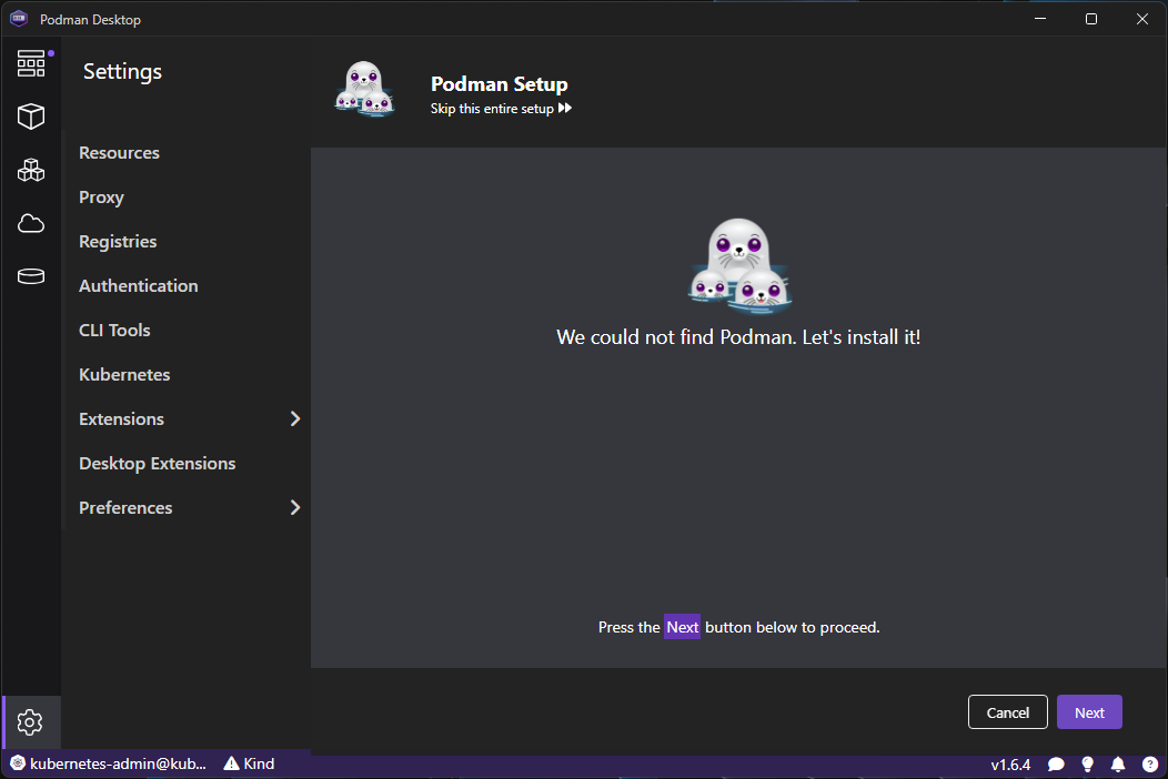 Podman desktop requires the underlying Podman to be installed. If it doesn’t find it, it will prompt you to install it from the Podman Desktop GUI. Click Next.