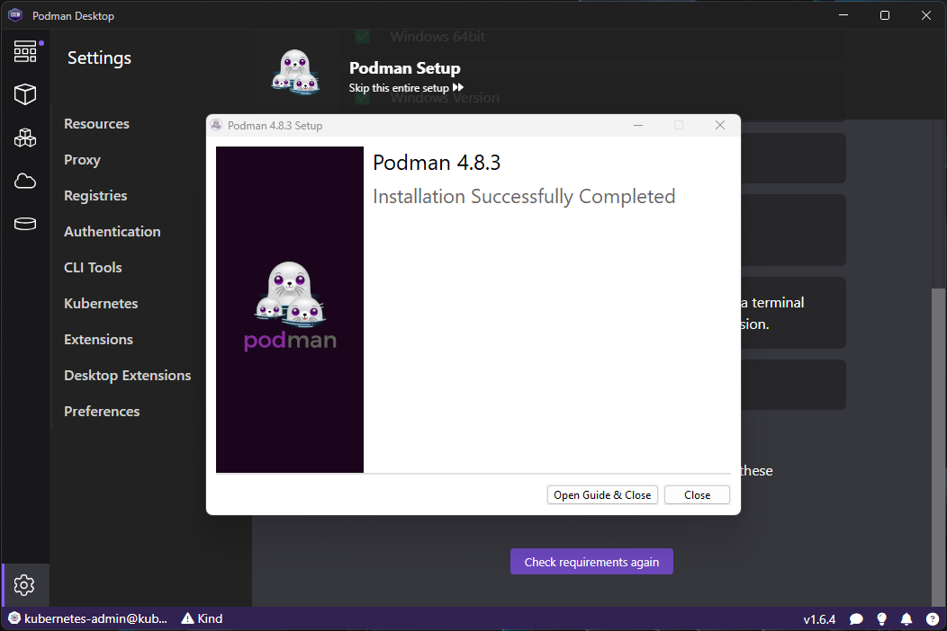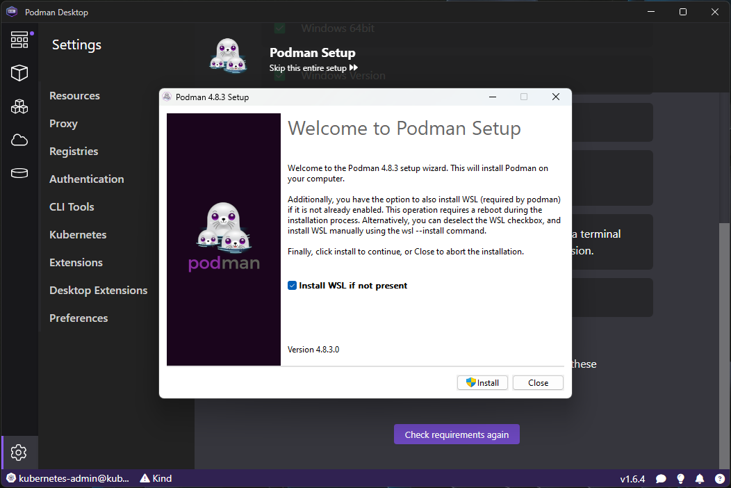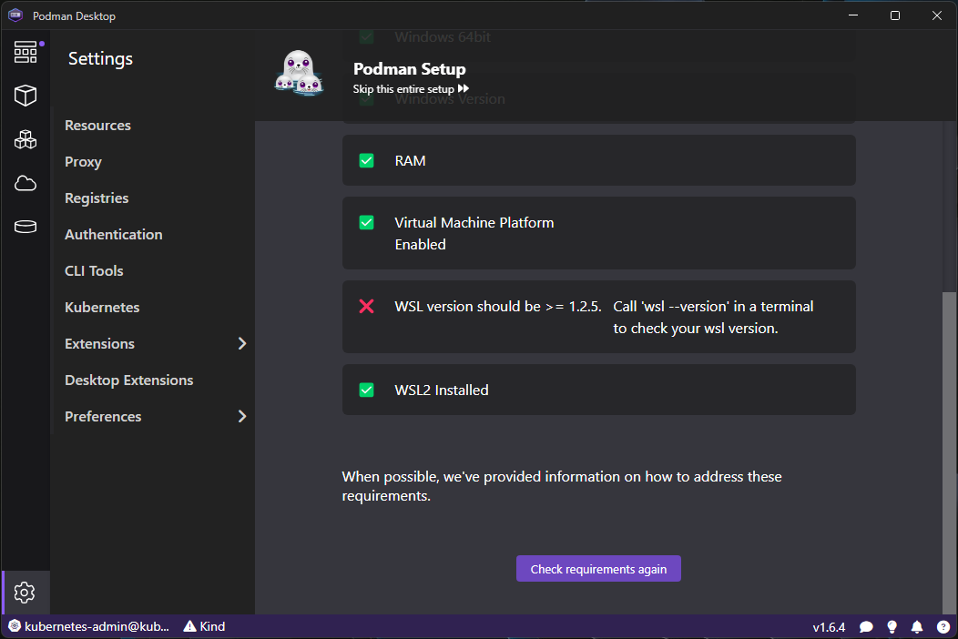 One of the interesting things I ran into was the prerequisites check saw WSL2 but had an issue with the WSL check. This is noted in the following GitHub bug for the project: Podman Desktop setup failed on requirement check: WSL version should be >= 1.2.5. ยท Issue #4982 ยท containers/podman-desktop ยท GitHub. The workaround is to install Podman manually from the official GitHub releases page here: Releases ยท containers/podman ยท GitHub.