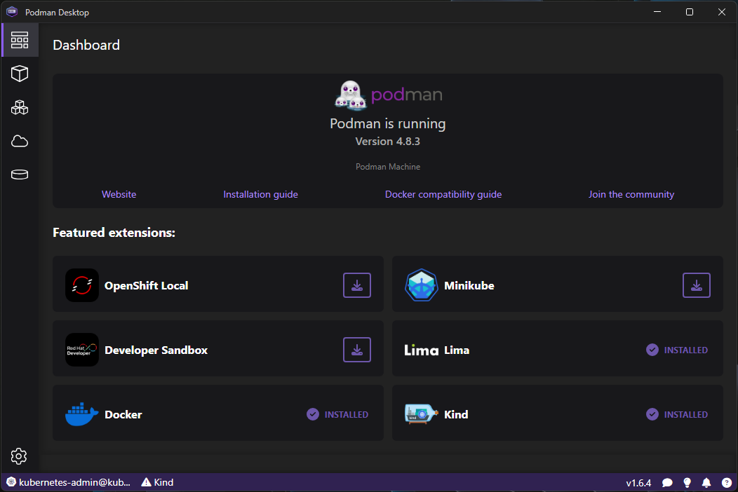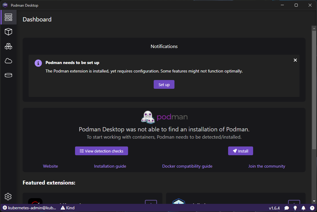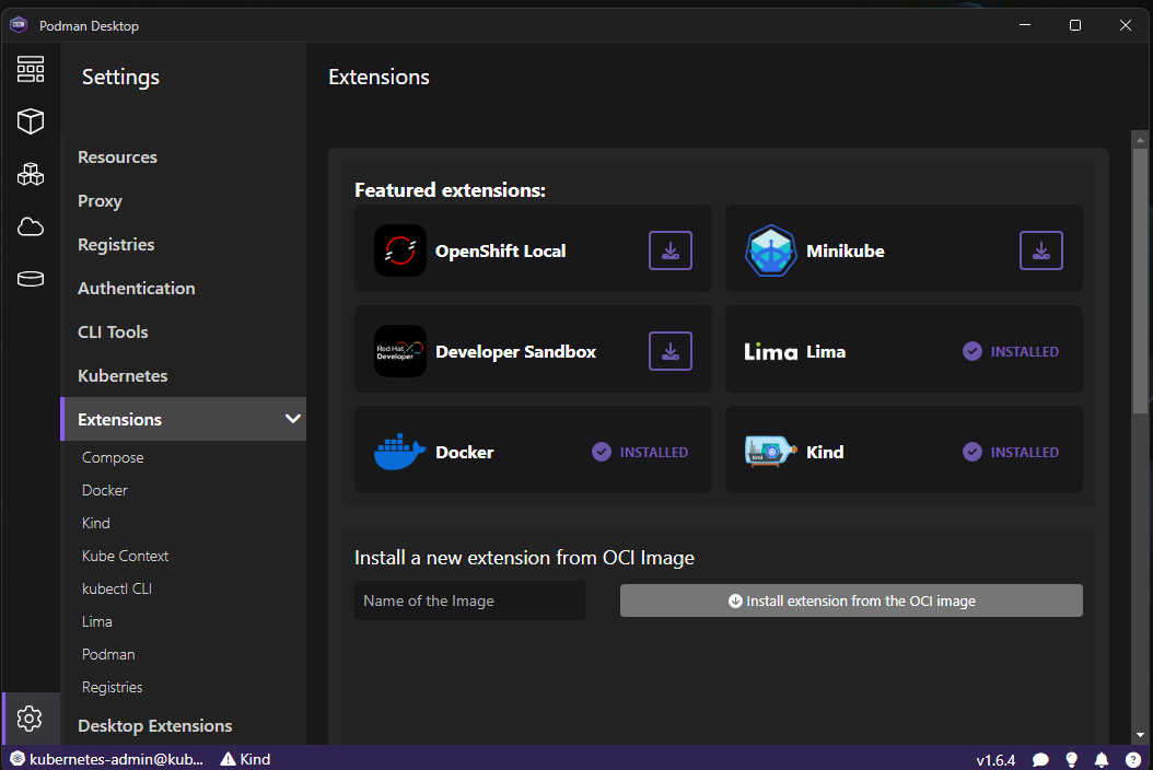 Docker and Podman both have extensions. Docker Desktop contains many extensions as part of the Docker Desktop tool. This allows extending Docker with new and cool functionality from third-party solutions. You can install tools like Headlamp and Kubescape to name a couple.
