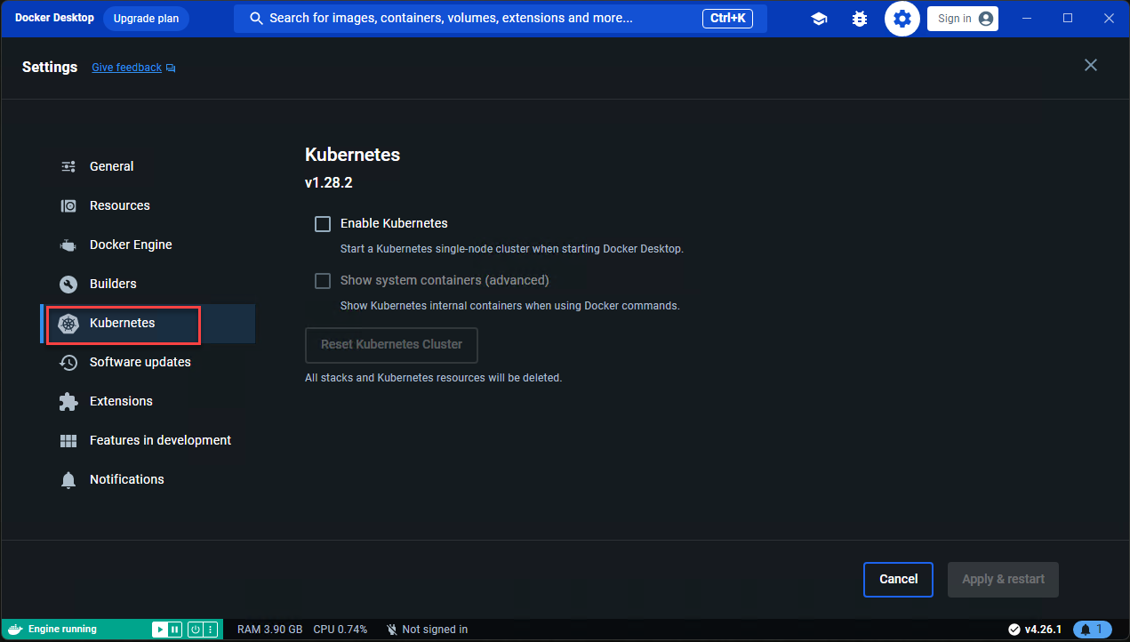 Both Docker and Podman have strong Kubernetes features built into their interfaces. With Docker, you can run Kubernetes mode natively as part of Docker Desktop. You can reset the cluster and manage other aspects of the configuration from the Docker Desktop program.