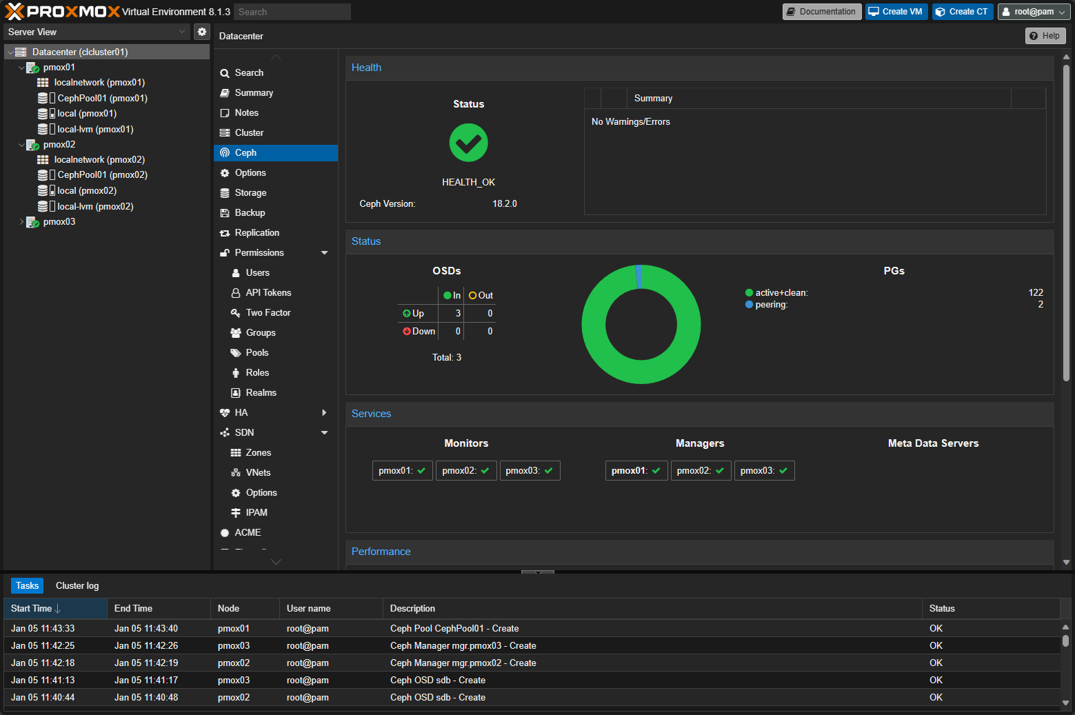 A healthy Ceph pool after installing Ceph on all three nodes, creating OSDs, Managers, Monitors, etc.