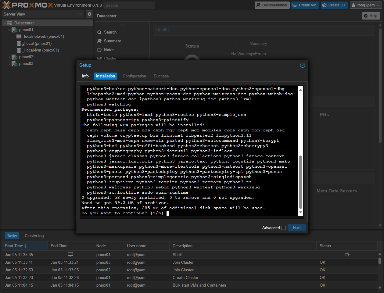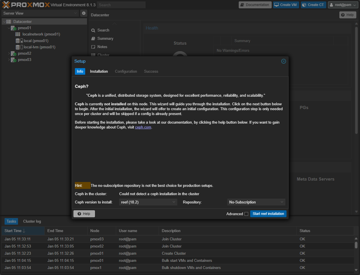 This launches the Info screen. Here I am choosing to install Ceph Reef and using the No-Subscription repo.