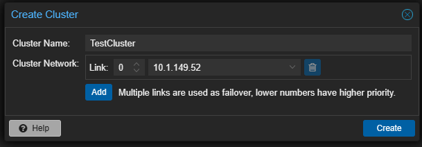 This will launch the Create Cluster dialog box. Name your cluster. It will default to your primary network link. You can Add links as a failover. Click Create.
