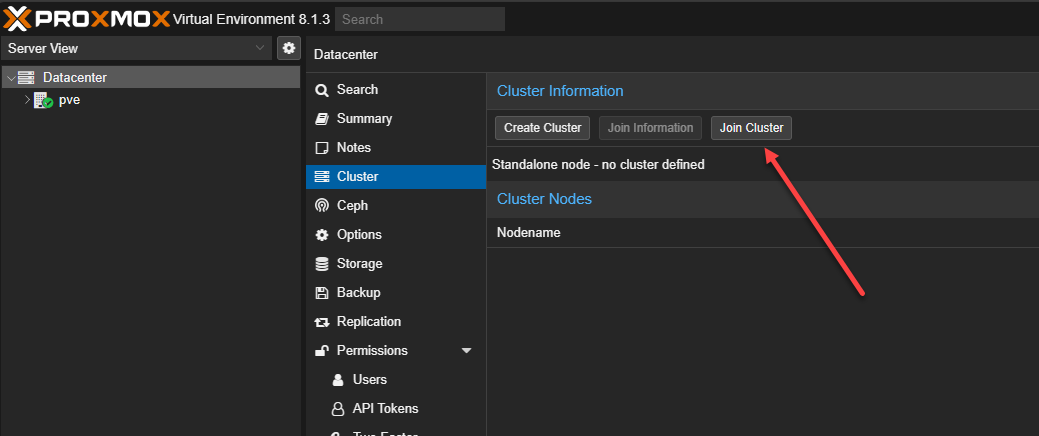 On the target node, we can click the Join Cluster button under the Datacenter > Cluster menu.