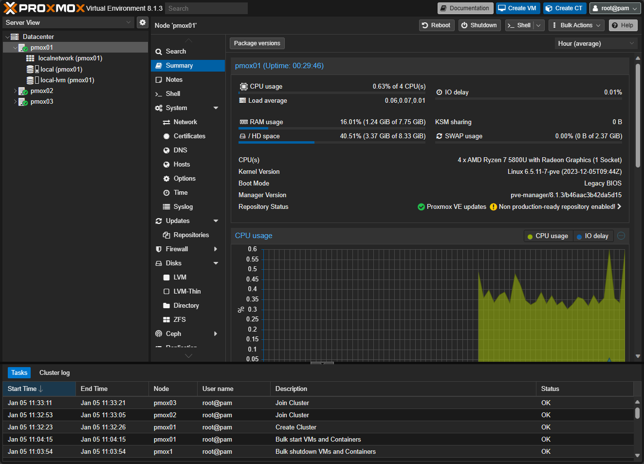 Below, I have three nodes in a Proxmox cluster running Proxmox 8.1.3 in the Proxmox UI.