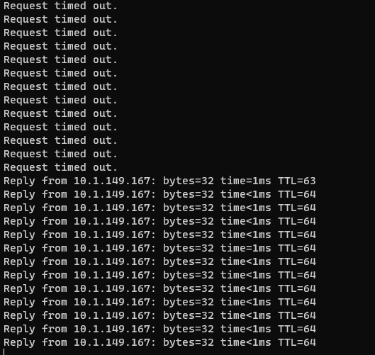 Now, I simulated a failure of the Proxmox host by disconnecting the network connection. The pings to the VM start timing out.