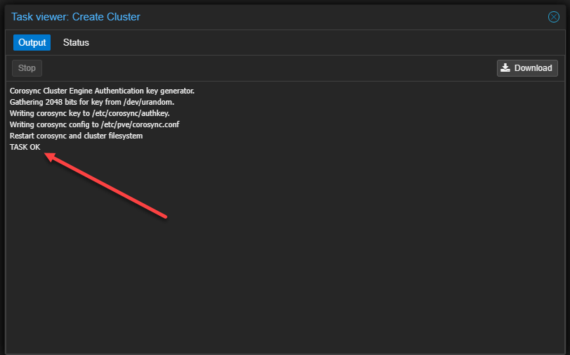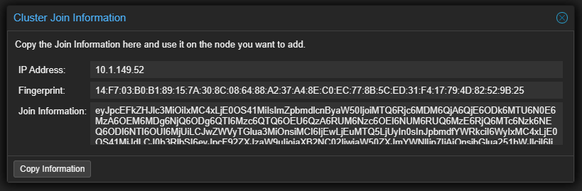 You can then click the Cluster join information to display the information needed to join the cluster for the other nodes. You can click the copy information button to easily copy the join information to the clipboard.