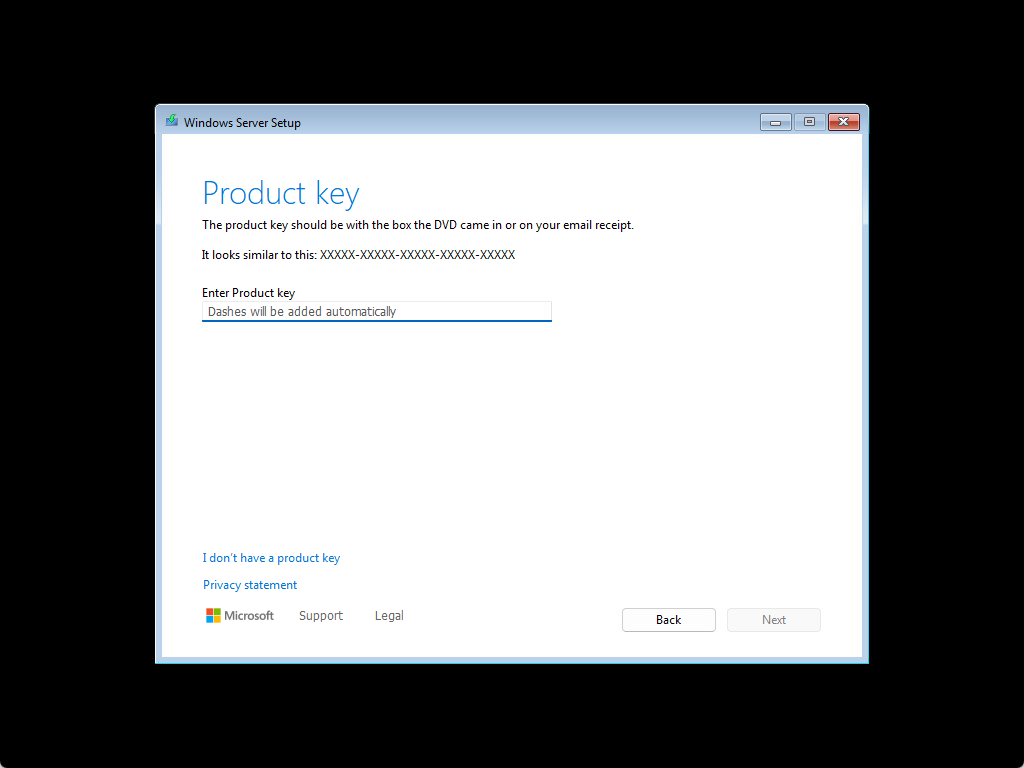 Enter the product key provided by Microsoft. Based on the product key, the installer will either display the options for Windows Server Standard edition or Windows Server Datacenter.