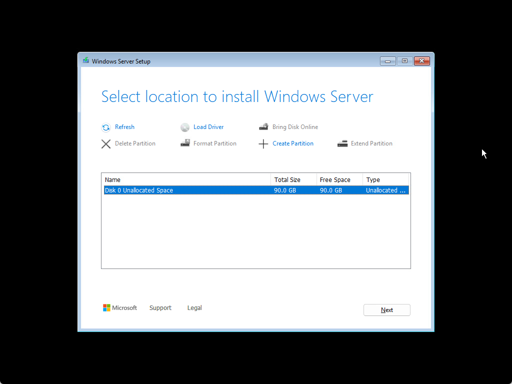 Now, we select the location to install Windows Server. You will see your hard disk here.