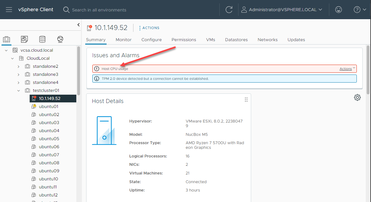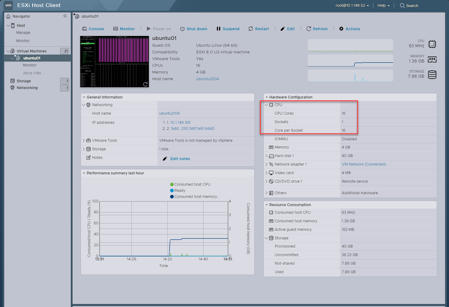 Also, if we monitor this in the vSphere Client if the host is connected to vCenter Server, or if we are connected directly to the host client, we see we have effectively saturated the CPUs with utilization.