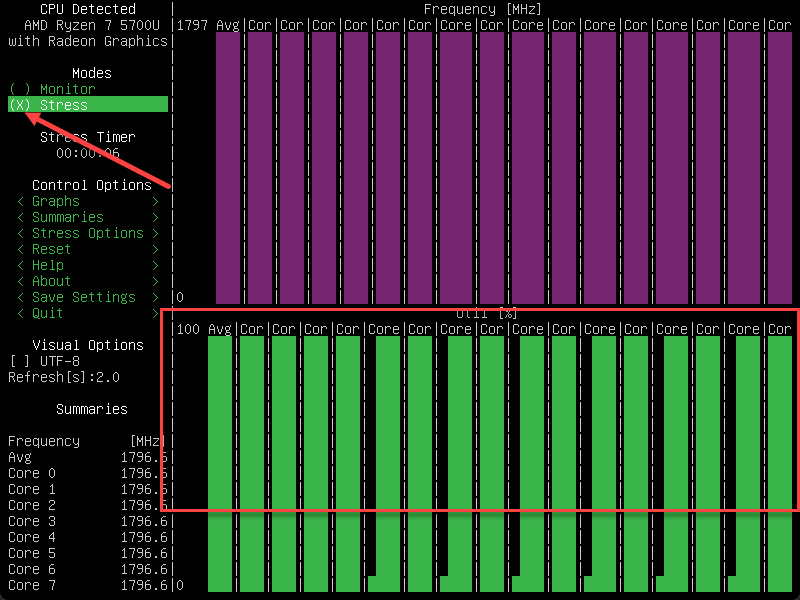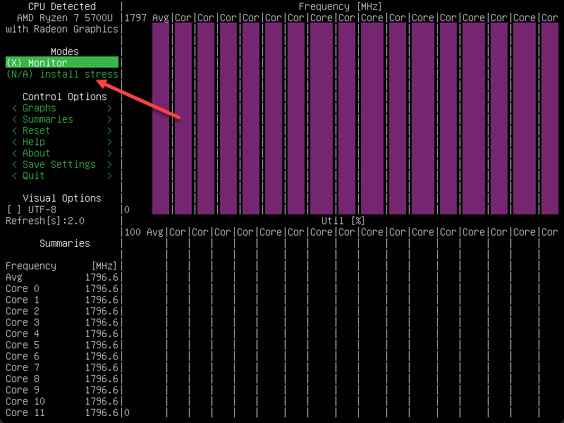 There is another tool I would like to introduce you to if you haven’t seen or heard about it as well. It is the S-TUI tool. The neat thing about this tool is that it provides a graphical interface of sorts that allows you to either monitor or stress the machine you are running it on.
