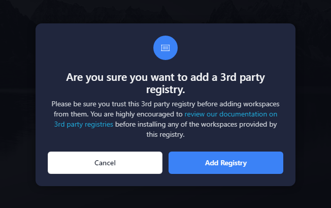 You will see the warning about adding 3rd party registries. Click Add Registry to finish adding the registry to Kasm.