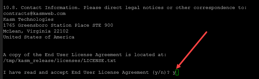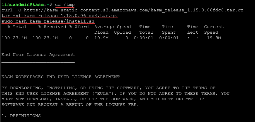 sudo bash kasm_release/install.shBelow is an example of running the commands. You will quickly see the EULA to agree to with the installation of Kasm.