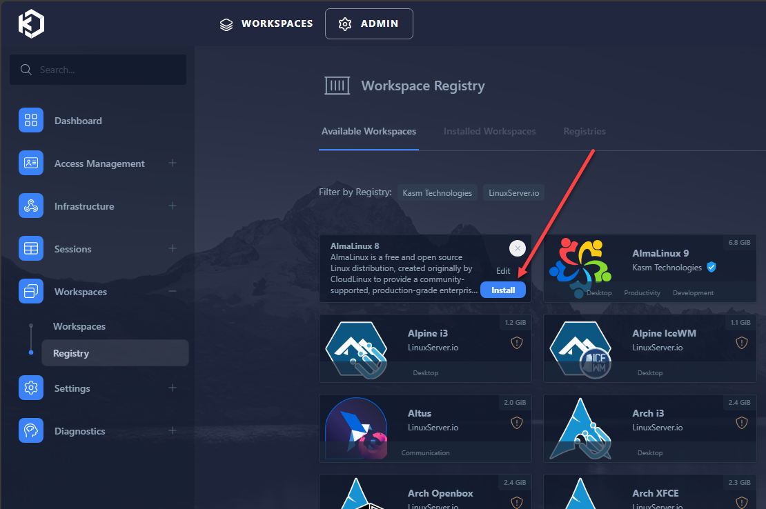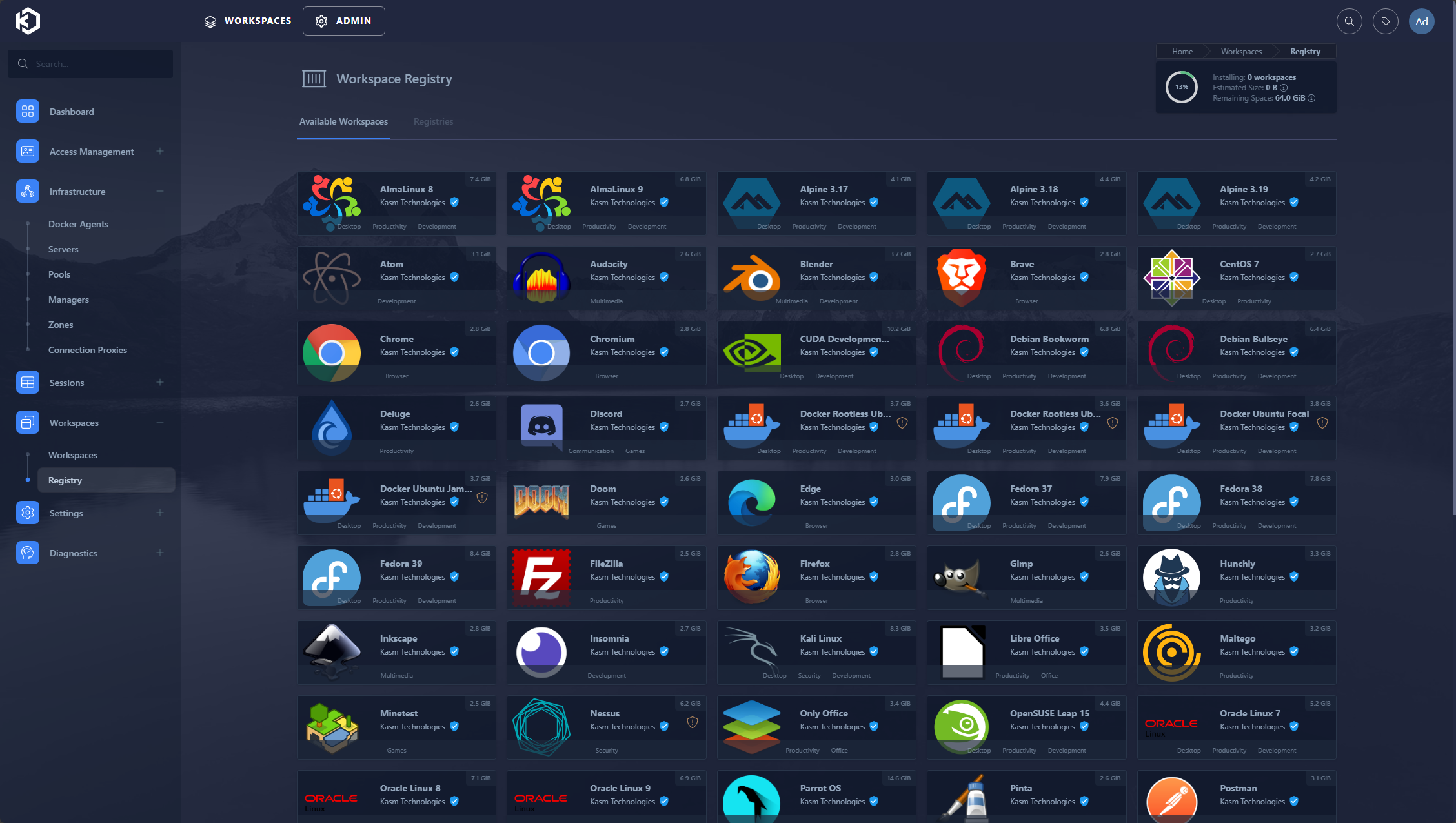 One of the really great things about Kasm is the number of workspaces that are available out of the box. Using what Kasm calls the registry, you can browse a catalog of Docker containerized services that can be used as the basis for a workspace. There are quite a few available workspaces by default as you can see below.