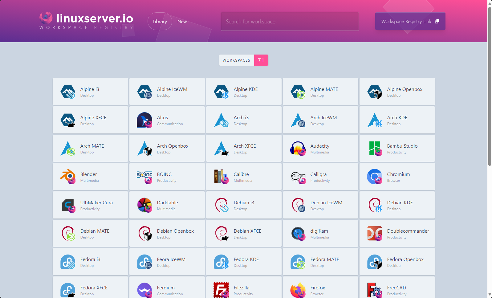 You can see the catalog of workspaces from Linuxserver.io below. It features a few more full desktop Linux operating system workspaces and several more utilities and apps.